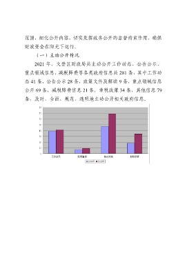 范围,细化公开内容,切实发挥政务公开的监督约束作用,确保 财政资金在阳光下运行。 (一)主动公开情况 2021 年,文登区财政局共主动公开工作动态、公告公示、 重点领域信息、减税降费等各类政府信息共 281 条,其中工作动 态 41 条,公告公示 28 条,政策文件及解读 9 条,重点领域信息 公开 69 条,减税降费信息 21 条,非税政策 34 条,其他信息 79 条,及时、全面、规范、透明地主动公开相关政府信息。