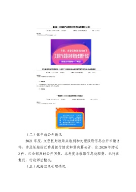 (二)依申请公开情况 2021 年度,文登区财政局共收到和处理政府信息公开申请 2 件,涉及征地拆迁费用拨付情况和预决算公开,比 2020 年增长 2 件,已全部及时公开回复,本年度未收取信息处理费,无行政 复议、行政诉讼情况。 (三)政府信息管理情况