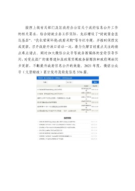 按照上级有关部门及区政府办公室关于政府信息公开工作 的相关要求,结合财政业务工作实际,先后增设了“财政资金直 达基层”、“优化营商环境-政府采购”等专栏专题,并按时保质完 成更新。召开政府开放日活动一次,着力化解百姓重点关注的痛 点难点堵点。同时加大微信公众号等政务新媒体的宣传引导作 用,对受众面广的重要通知及政策实现政务新媒体和政府网站同 步更新,不断提升政府信息公开的效能。2021 年度,微信公众 号(文登财政)累计发布及转发信息 376 篇。