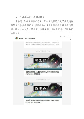 (四)政务公开工作创新情况 本年度,依托局微信公众号,区交通运输局开通了交通运输 局领域行政处罚曝光台,在微信公众号自主菜单栏设置了查询服 务,提供社会大众法律查询、运政查询、标准化查询、危险品查 询等功能。
