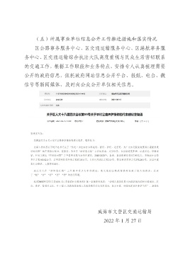 (五)所属事业单位信息公开工作推进措施和落实情况 区公路事务服务中心、区交通运输服务中心、区港航事务服 务中心、区交通运输综合执法大队高度重视与民众生活密切联系 的交通工作,根据工作职能和业务特点,安排专人认真梳理需要 公开的政府信息,依托政府网站信息公开平台、报纸、电台、微 信号等新闻媒体,及时向公众公开单位相关信息。 威海市文登区交通运输局 2022 年 1 月 27 日