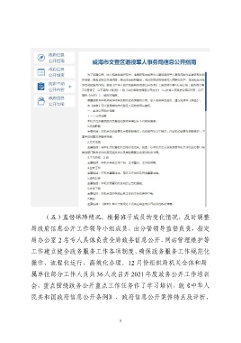 (五)监督保障情况。根据班子成员的变化情况,及时调整 局政府信息公开工作领导小组成员,由分管领导监督负责,指定 局办公室 2 名专人具体负责全局政务信息公开、网站管理维护等 工作建立健全政务服务工作各项制度,确保政务服务工作规范化 操作、流程化运行、高效化办理。12 月份组织局机关全体和局 属单位部分工作人员共 36 人次召开 2021 年度政务公开工作培训 会,重点围绕政务公开重点工作任务作了学习培训,就《中华人 民共和国政府信息公开条例》、政府信息公开案件特点及评析、 5