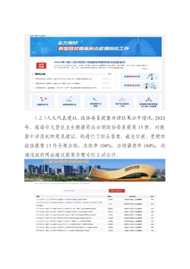 (三)人大代表建议、政协委员提案办理结果公开情况。2021 年,威海市文登区卫生健康局共办理政协委员提案 13 件。对提 案中涉及到的意见建议,均进行了回应答复。截至目前,受理的 政协提案 13 件全部办结,办结率 100%,办结满意率 100%,均 通过政府网站建议提案办理专栏主动公开。