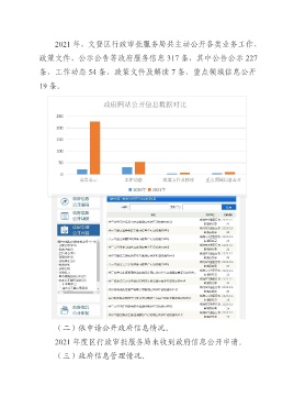 2021 年,文登区行政审批服务局共主动公开各类业务工作、 政策文件、公示公告等政府服务信息 317 条,其中公告公示 227 条、工作动态 54 条、政策文件及解读 7 条、重点领域信息公开 19 条。 (二)依申请公开政府信息情况。 2021 年度区行政审批服务局未收到政府信息公开申请。 (三)政府信息管理情况。