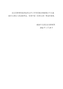 区应急管理局政府信息公开工作年度报告数据统计可从威 海市文登区人民政府网站、信用中国(信用文登)等途径查询。 威海市文登区应急管理局 2022 年 1 月 28 日