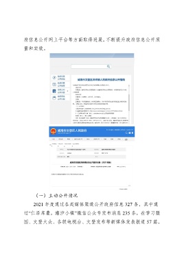 府信息公开网上平台等方面取得进展,不断提升政府信息公开质 量和实效。 (一)主动公开情况 2021 年度通过各类媒体渠道公开政府信息 327 条,其中通 过“仁泽库豊,潮汐小镇”微信公众号发布消息 235 条,在学习强 国、文登大众、各级电视台、文登发布等新媒体发表报道 57 篇,