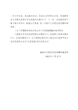 一步工作计划。通过此次活动,征求业主的意见 12 条,现场解答 业主对物业管理中存在的疑点问题 16 个。下一步,区住建局将不 断丰富公开形式,拓宽公开渠道,进一步提升人民群众获得感和满 意度。 (五)所属事业单位信息公开工作推进措施和落实情况 下属事业单位区住房保障公共服务中心、区建筑工程事务服务 中心、区物业服务中心、区人防事务服务中心通过区住建局平台以 及区住建局公众号“文登住建”进行信息公开。 威海市文登区住房和城乡建设局 2022 年 1 月 27 日