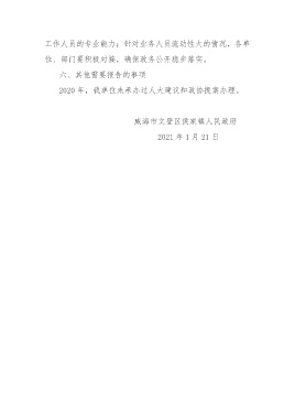 工作人员的专业能力;针对业务人员流动性大的情况,各单 位、部门要积极对接,确保政务公开稳步落实。 六、其他需要报告的事项 2020 年,我单位未承办过人大建议和政协提案办理。 威海市文登区侯家镇人民政府 2021 年 1 月 21 日